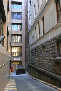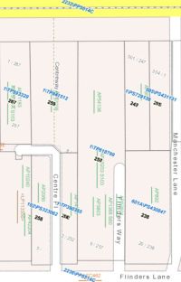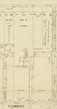 Furthermore, the two sub allotments became separated over time – the one part facing Collins Street and the one part facing Flinders Lane. The divisions can be seen quite clearly across Flinders Lane.